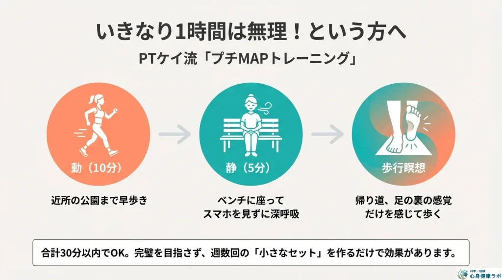 - 🕊 小さく始める 「10分歩いて、5分呼吸」。これだけで立派なMAPトレーニングです。完璧を目指さず、できる範囲で取り入れましょう。