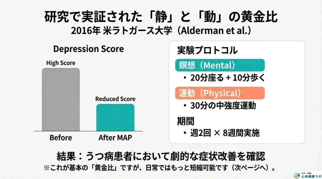 2016年、アメリカのラトガース大学のAldermanら研究グループが発表した研究によると、「瞑想」と「有酸素運動」を組み合わせたトレーニング(MAPトレーニング)が、うつ病の症状改善に劇的な効果をもたらすことが示唆されています。今回は、この興味深い研究を紐解いていきましょう。