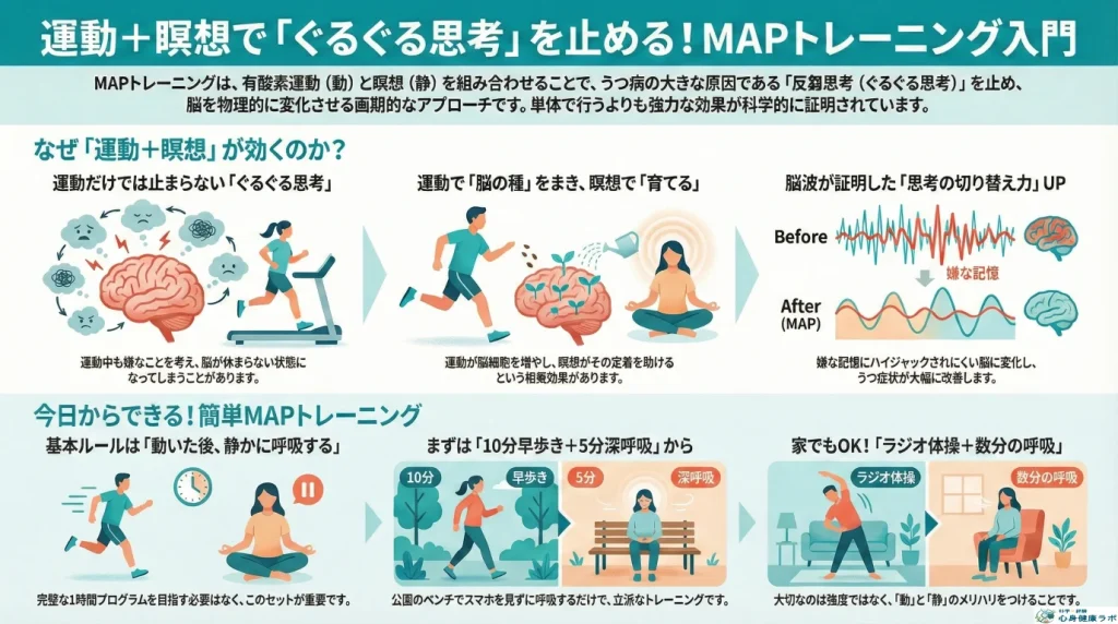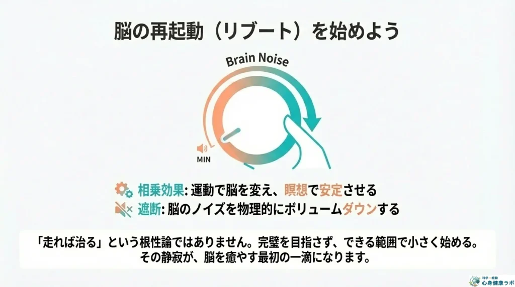 - ✅ 【効果】脳の「反芻思考」を止める 過去の失敗を無限に考えてしまう「脳の癖」を、運動による神経新生と、瞑想による注意制御のダブル効果で断ち切ります。