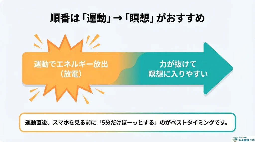 「いきなり1時間のトレーニングなんて無理!」と思いますよね。安心してください。大切なのは「運動の後に、静かに呼吸する時間をセットにする」という原則です。