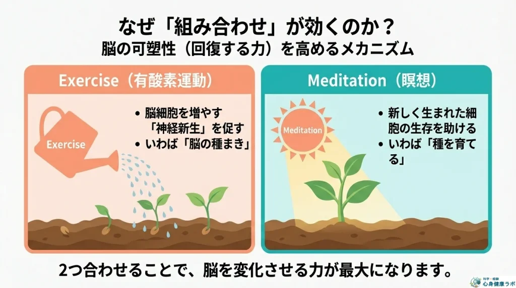 これまでの研究で、有酸素運動は「脳細胞を増やす(神経新生)」効果があり、瞑想は「新しく生まれた細胞の生存を助ける」効果があることがわかっています。つまり、運動で脳の種をまき、瞑想でそれを育てる。この2つを合わせることで、単独で行うよりも強力に脳の可塑性(※脳が変化し回復する力)を高めることができるのです。