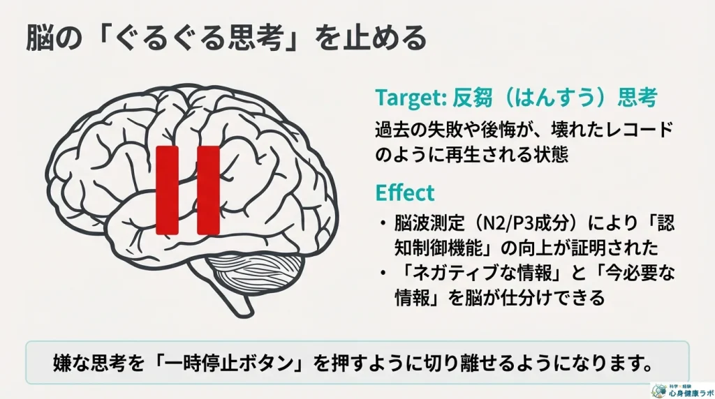 うつ病の特徴の一つに、ネガティブな考えが頭から離れない「反芻思考」があります。研究では、脳波測定(N2成分とP3成分)を行い、「認知制御機能」が向上したことを確認しました。 簡単に言うと、脳が「ネガティブな情報」と「今必要な情報」を正しく仕分けできるようになり、嫌な記憶にハイジャックされにくい脳に変化したのです。
