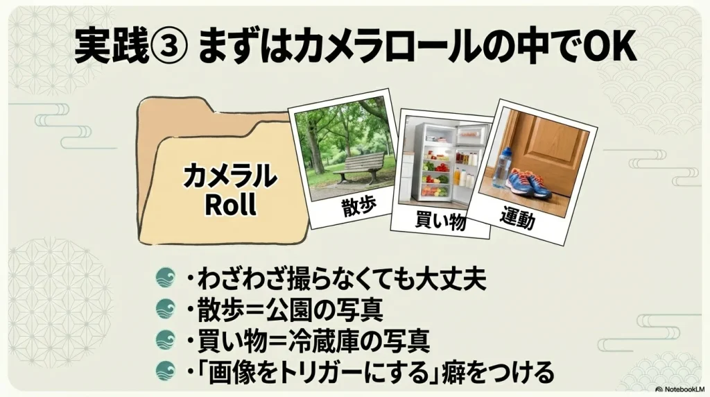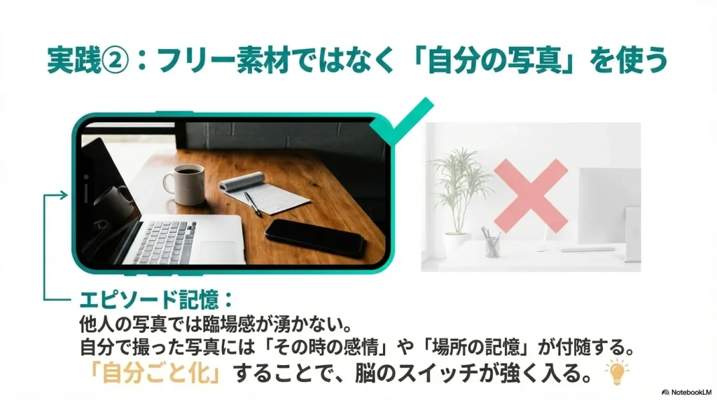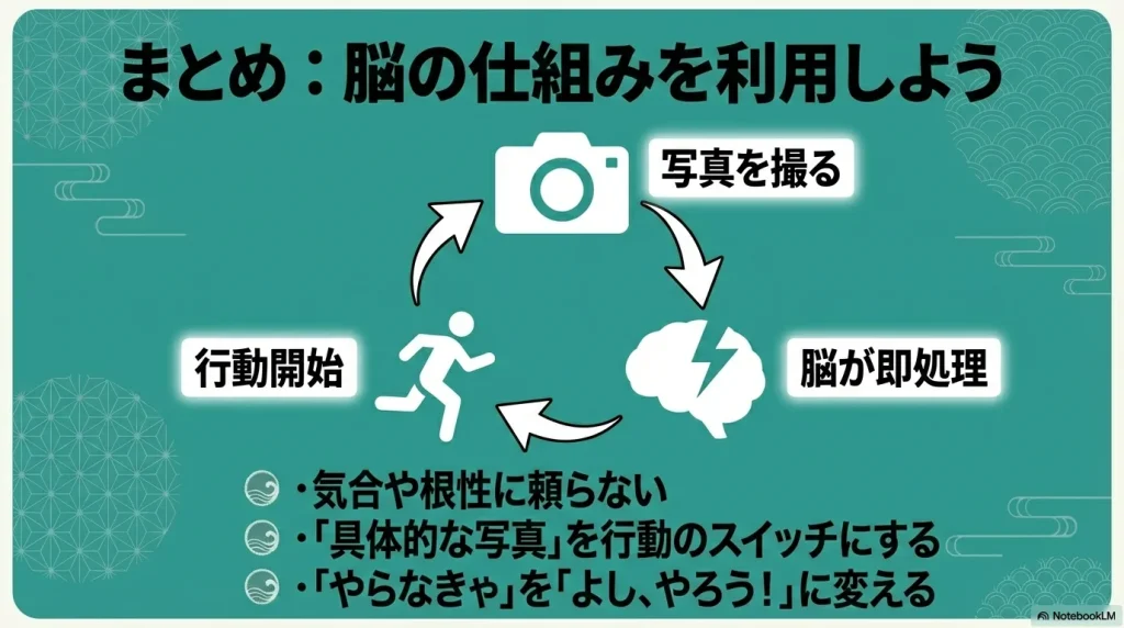 - 最強のトリガは「具体的な写真」: あなたの行動を最も加速させてくれるのは、文字でもイラストでもなく、「タスクの実行を具体的にイメージできる写真」です。自分が使う物、行く場所、会う人などを写真に撮ってみましょう。