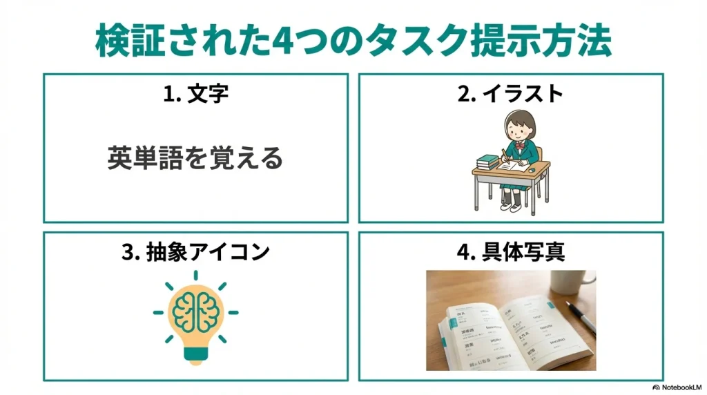 - 最強の画像とは?: 最も効果があったのは、「タスクを具体的にイメージできる写真」でした。一方、抽象的な「イラスト」は、文字よりも逆効果になる可能性も示唆されています。