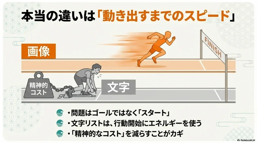 これは、私たち自身の経験とも一致するのではないでしょうか。どんなにやる気がなくても、締め切りが迫ればなんとか終わらせる。結局、やるべきことは最終的にはやることが多い。つまり、「タスクを完了させる」という最終的なゴールにおいては、文字だろうが画像だろうが、大きな違いは生まれにくいのです。
