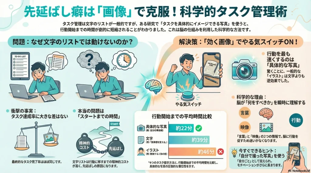 私たちはこれまで、タスク管理といえば「文字でリストアップする」のが当たり前だと思ってきました。でも、もしその常識が、あなたの「やる気」をむしろ削いでいたとしたら…?もし、あなたの先延ばし癖を解消する鍵が、意外なもの、つまり「画像」にあるとしたら、どうでしょう。