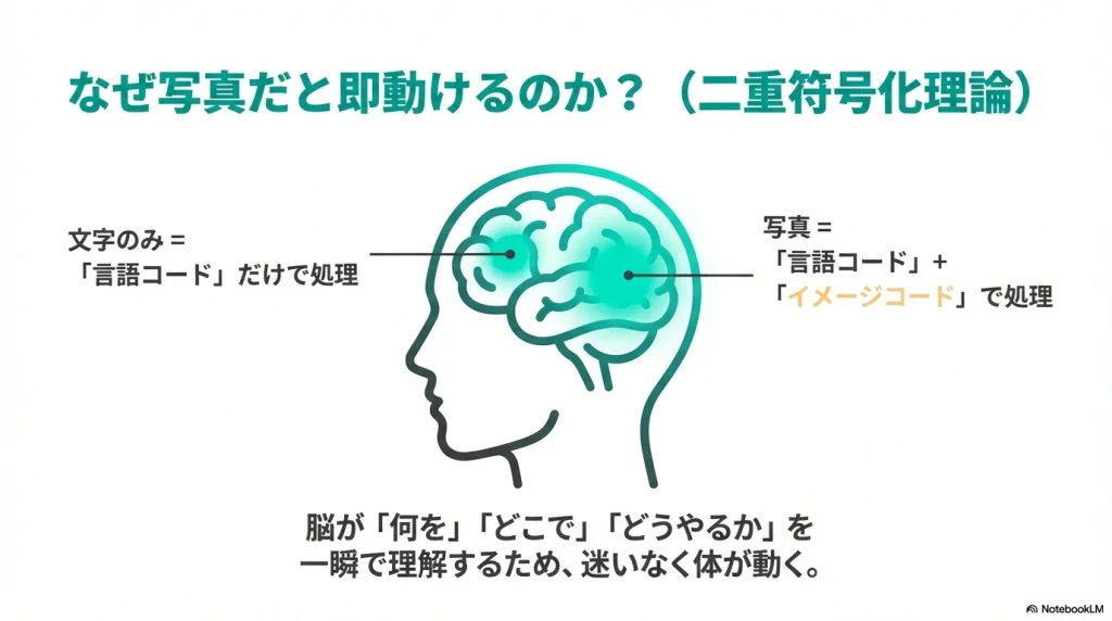一方で、「自分が持っている単語帳の写真」のような具体表現画像は、なぜこれほどまでに強力なのでしょうか。その秘密は「二重符号化理論」にあります。