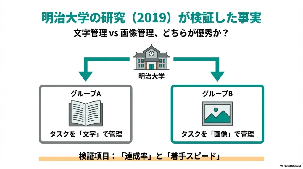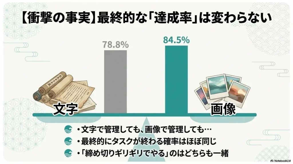 - 衝撃の事実: タスクを「文字」で管理しても「画像」で管理しても、最終的な達成率に大きな差はないことが判明しました。