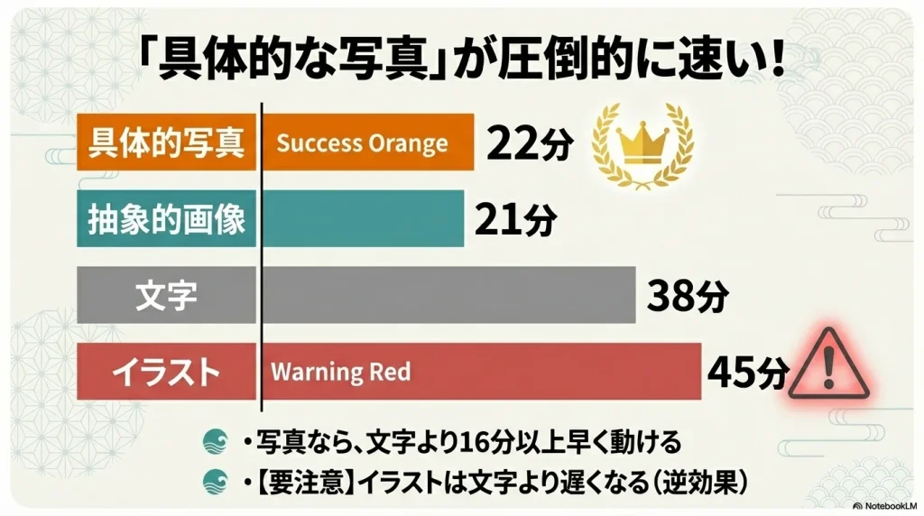 まず衝撃的なのは、「イラスト画像」が「文字」よりも時間がかかっているという点です。なんと、4つの中で最も行動を遅らせる結果となってしまいました。良かれと思って可愛いイラストを探してきても、それは逆効果だったのかもしれません。