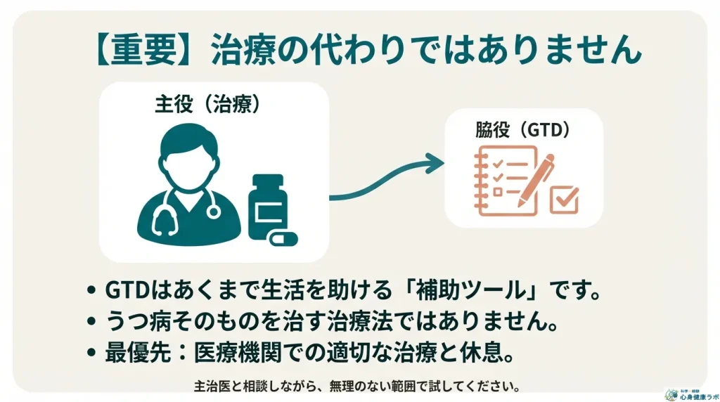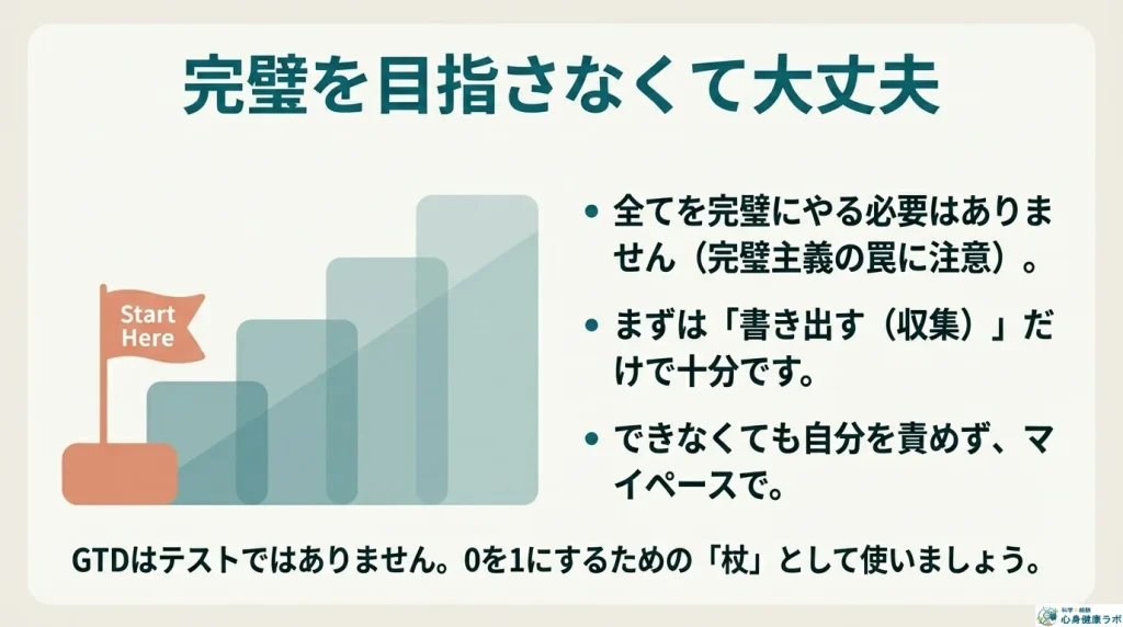 - GTDは、小さな成功体験を積み重ね、「自分にもできる」というコントロール感覚を取り戻す手助けになるかもしれない。
