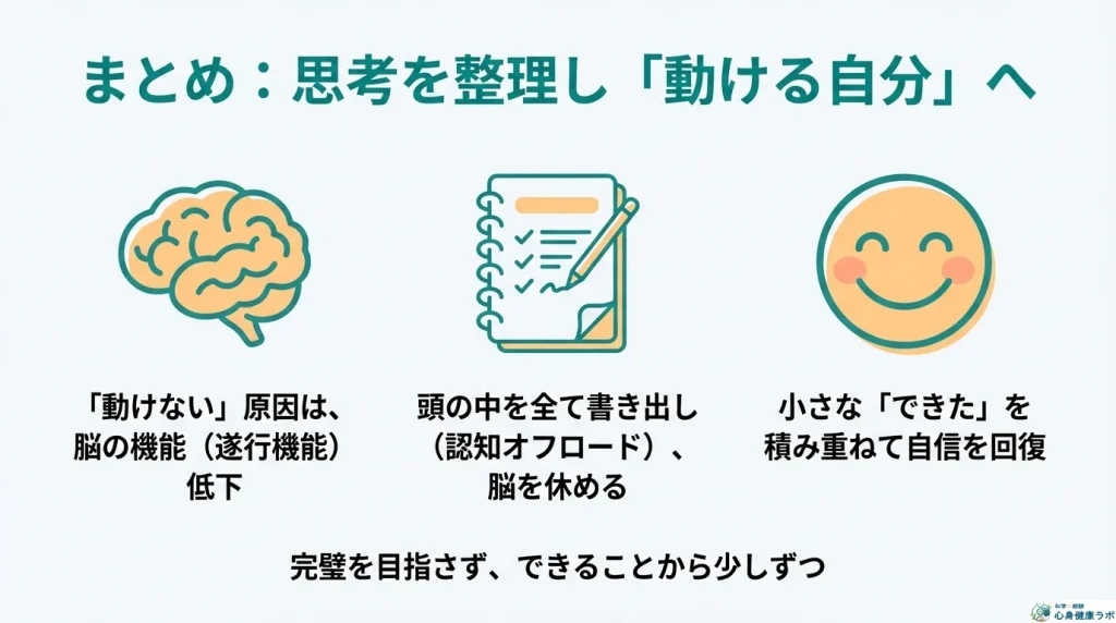 もしあなたが「試してみたい」と感じたら、完璧を目指さず、まずは「頭の中を書き出す」ことだけから始めてみてください。その小さな一歩が、あなたの「動けない」毎日を少しずつ変えていくきっかけになることを、心から願っています。
