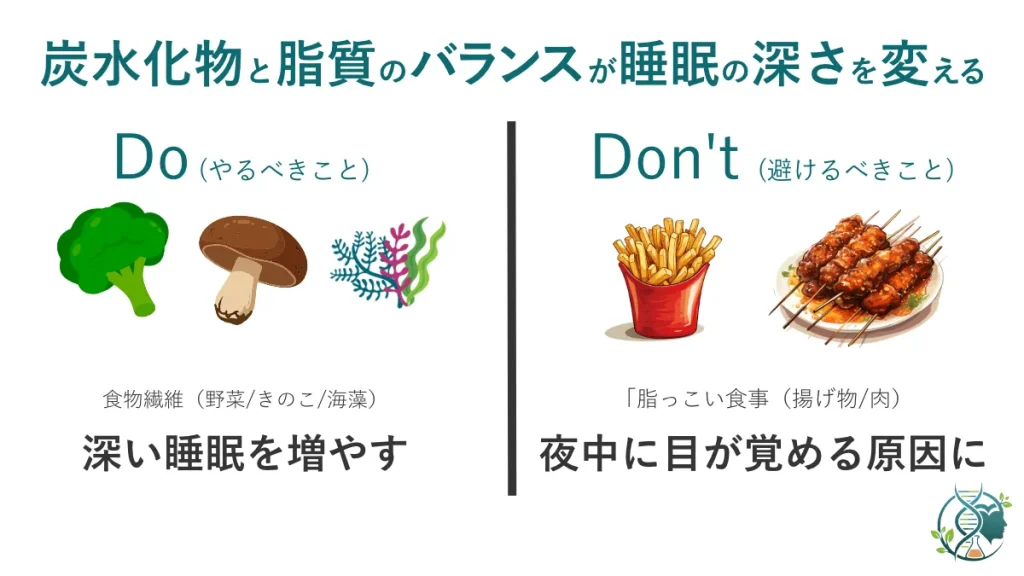 - 炭水化物や脂質のバランス、食物繊維の摂取が、睡眠の深さやリズムを左右する。