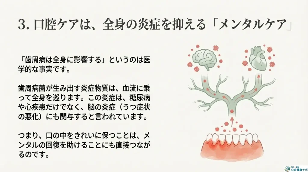 歯周病菌が生み出す炎症物質は、血流に乗って全身を巡り、糖尿病や心疾患、そして脳の炎症(うつ症状の悪化)にも関与すると言われています。