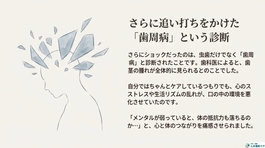 「メンタルが弱っていると、体(歯茎)の抵抗力も落ちるのかな…」と、心と体のつながりを痛感させられました。