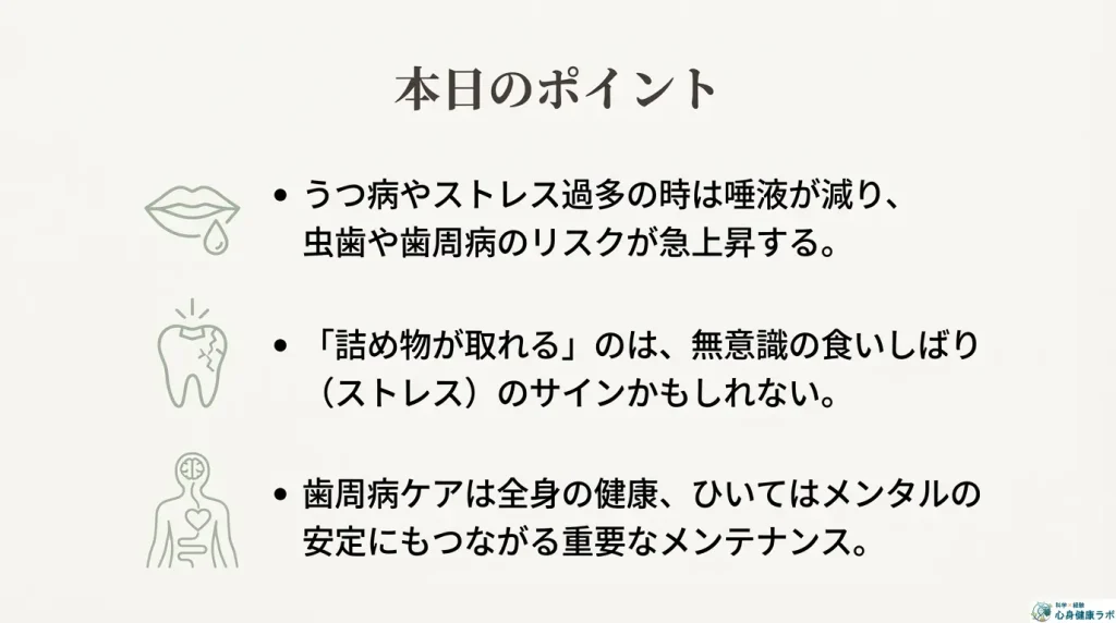 自分ではちゃんとケアしているつもりでも、心のストレスや生活リズムの乱れが、知らず知らずのうちに口の中の環境を悪化させていたのかもしれません。