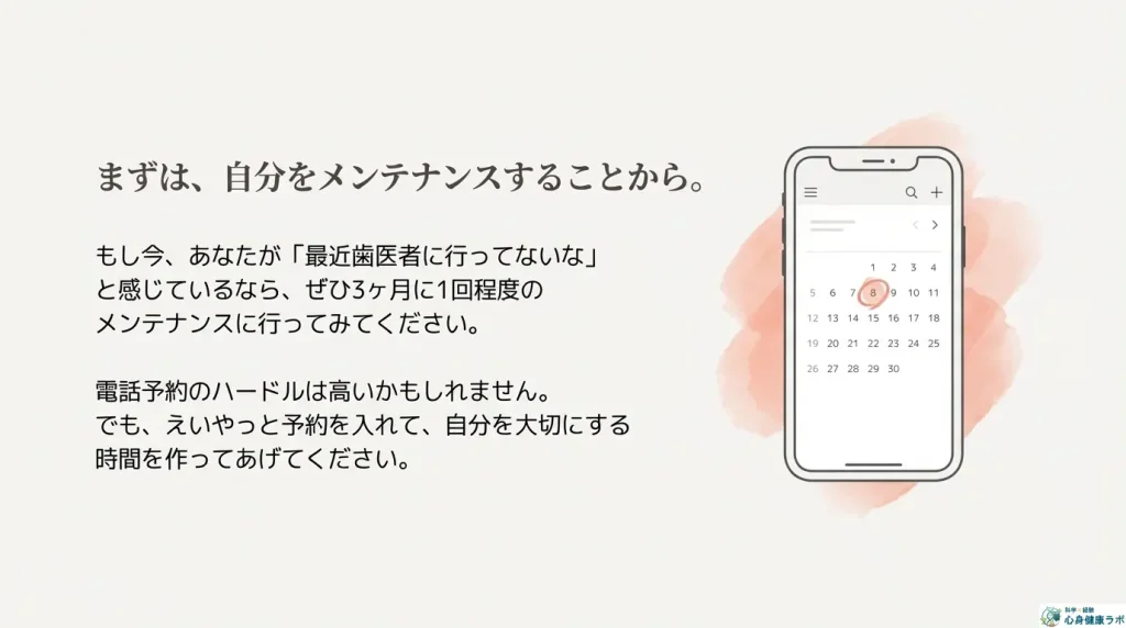 もし今、あなたが「最近歯医者に行ってないな」と感じているなら、ぜひ3ヶ月に1回程度のメンテナンスに行ってみてください。