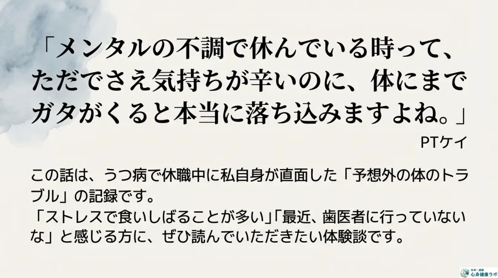 今回は、私自身がうつ病で休職していた時に直面した、「予想外の体のトラブル」についてお話ししようと思います。