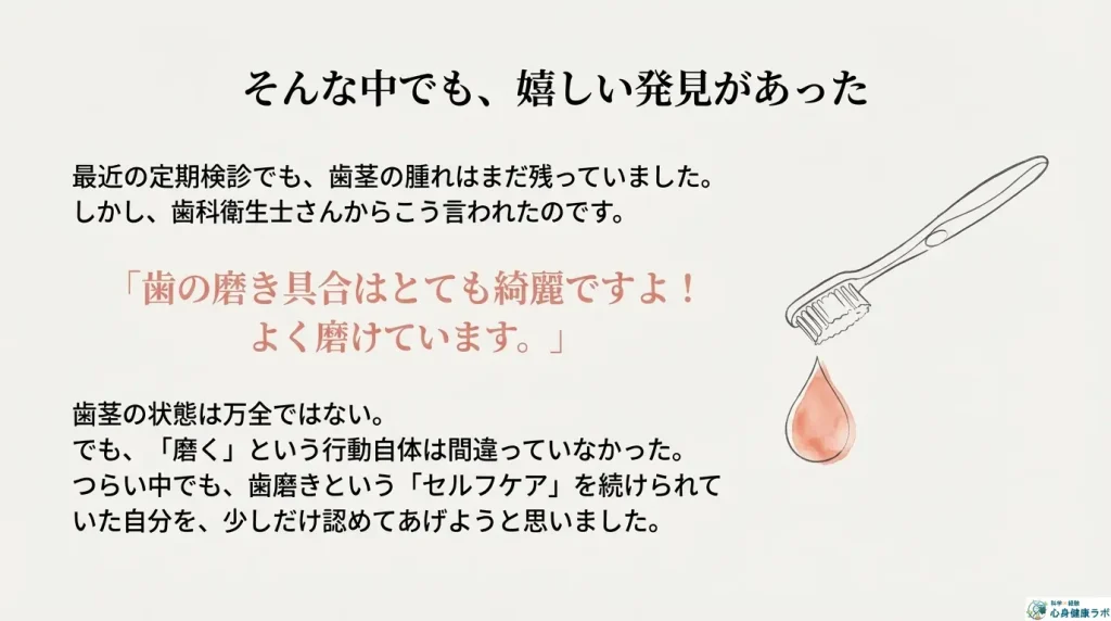 うつ病でしんどい中でも、歯磨きという「セルフケア」を続けられていた自分を、少しだけ認めてあげようと思いました。