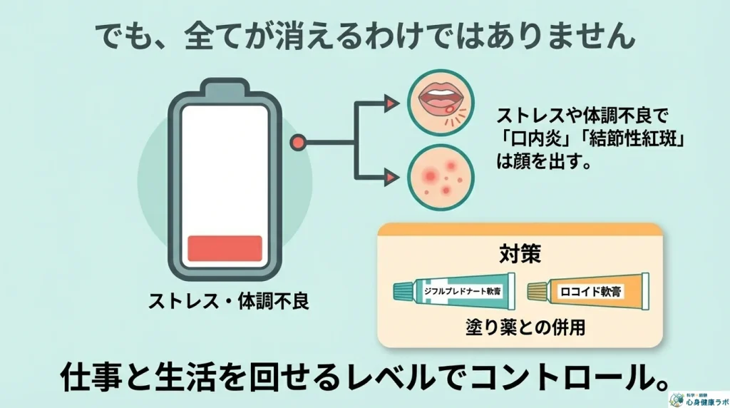 一方で、口内炎や皮膚にできる赤いしこり(結節性紅斑)は、完全に消えたわけではありません。 仕事のストレスがかかったり、体調が崩れたりすると、やはり症状は顔を出します。