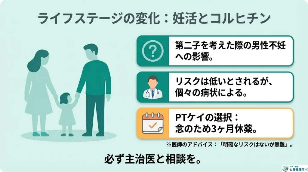 30代となると、仕事だけでなく「妊活」などのライフイベントも重なります。 私は男性ですが、第二子を考えた際、コルヒチンの影響が気になり主治医に相談しました。