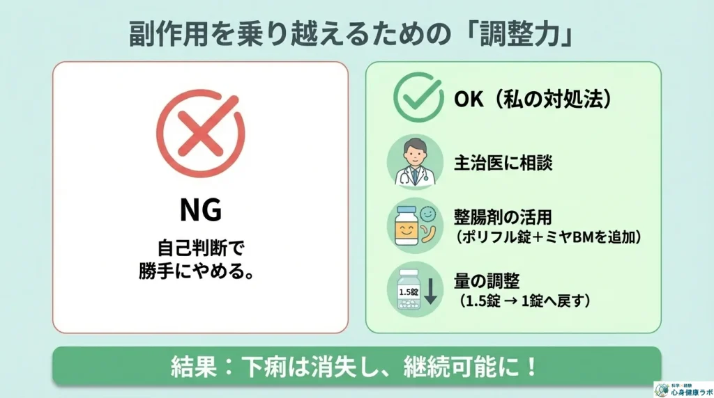 - ✅ 【副作用と調整】 代表的な副作用は「下痢」です。私も経験しましたが、医師と相談し服用量を調整することで克服できました。自己判断での中止は避けましょう。