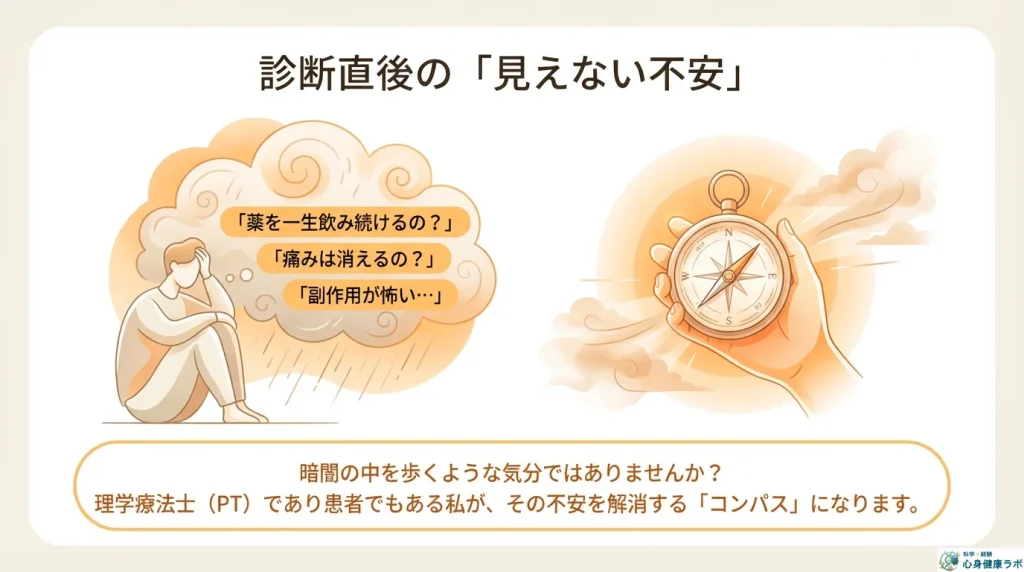 その気持ち、痛いほどわかります。私も最初は原因不明の足の腫れと痛みに襲われ、「一生このままなのかな」と暗闇の中を歩くような気分でした。