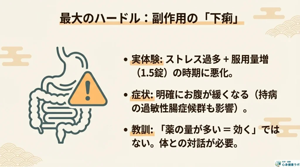 ただ、副作用には悩まされました。 代表的な副作用である「下痢」です。 一時期、ストレス過多な時期に、処方量が「1.5錠」に増えた際、明確にお腹が緩くなりました。