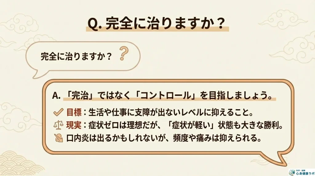 【読者への最後のエール】 ベーチェット病は見えない疲れや痛みを伴う孤独な戦いになりがちです。でも、あなたは一人ではありません。私たちがこうして情報を共有し、科学の力を借りることで、コントロールできる未来は必ずあります。焦らず、今日できるケアを一つずつ積み重ねていきましょう。