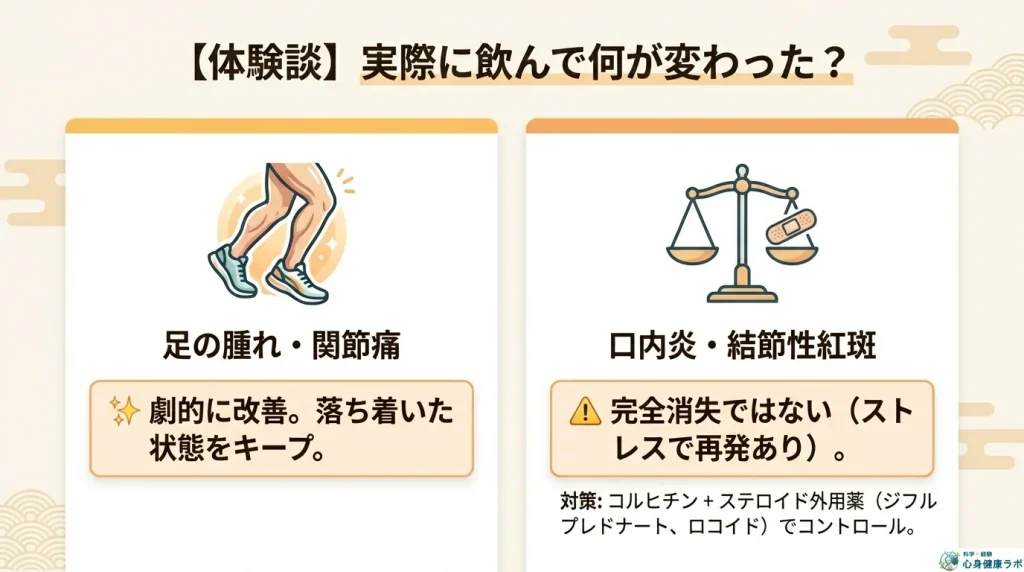 - ✅ 【効果の実感】 私の体験では、特に「関節(足)の腫れ」に著効しました。口内炎や紅斑は、塗り薬との併用でコントロール可能なレベルに落ち着いています。