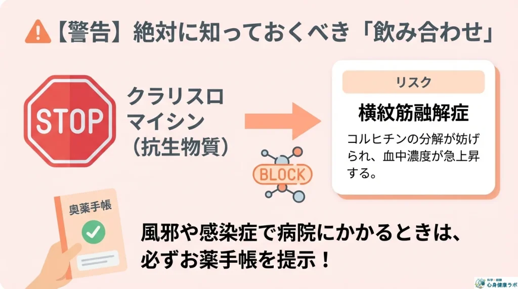 - 🕊 【まとめ3】飲み合わせには要注意 特にクラリスロマイシンなどの抗生物質との併用は危険です。お薬手帳は常に携帯し、自分の身を守ってください。