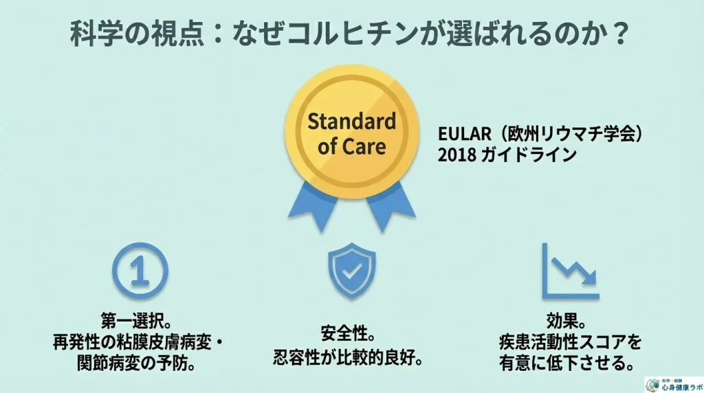 2021年、Hatemiら(EULAR:欧州リウマチ学会)の推奨によると: ベーチェット病におけるコルヒチンは、特に再発性の粘膜皮膚病変(口内炎や陰部潰瘍など)や関節病変の予防として「第一選択(first to be tried)」と位置づけられています。安全性と忍容性が比較的良好であるため、初期治療として広く用いられています。