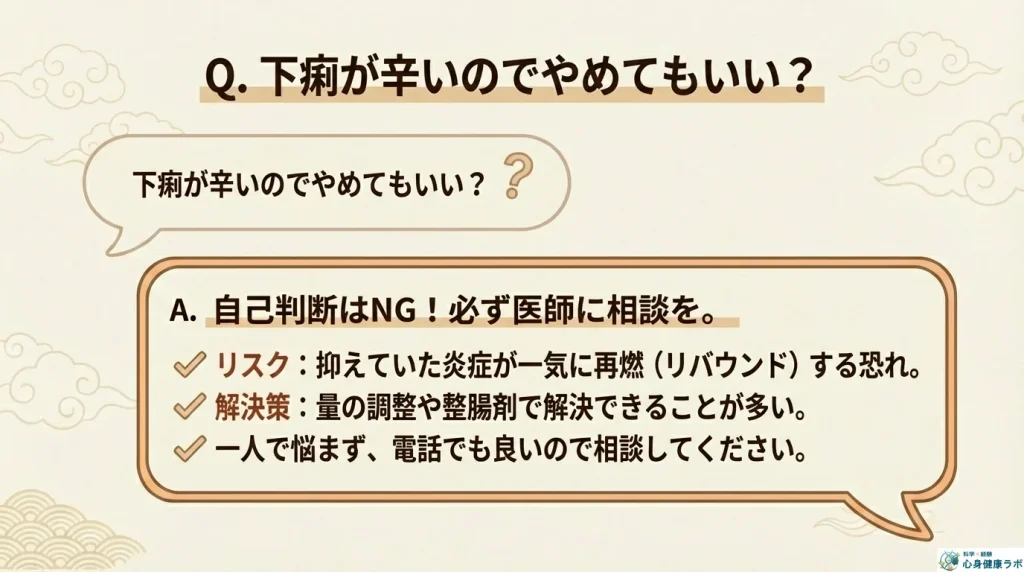 - 🎯 【まとめ2】副作用は医師と二人三脚で 下痢などの消化器症状が出た場合は、量を調整することで継続できることが多いです。自分一人で抱え込まず、すぐに相談を。