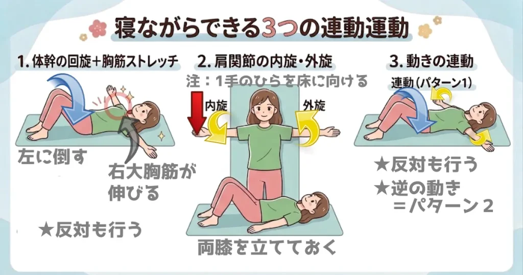 - 動きの連動(パターン2):腕を内旋(手のひらが床)した側に、両膝を一緒に倒します。